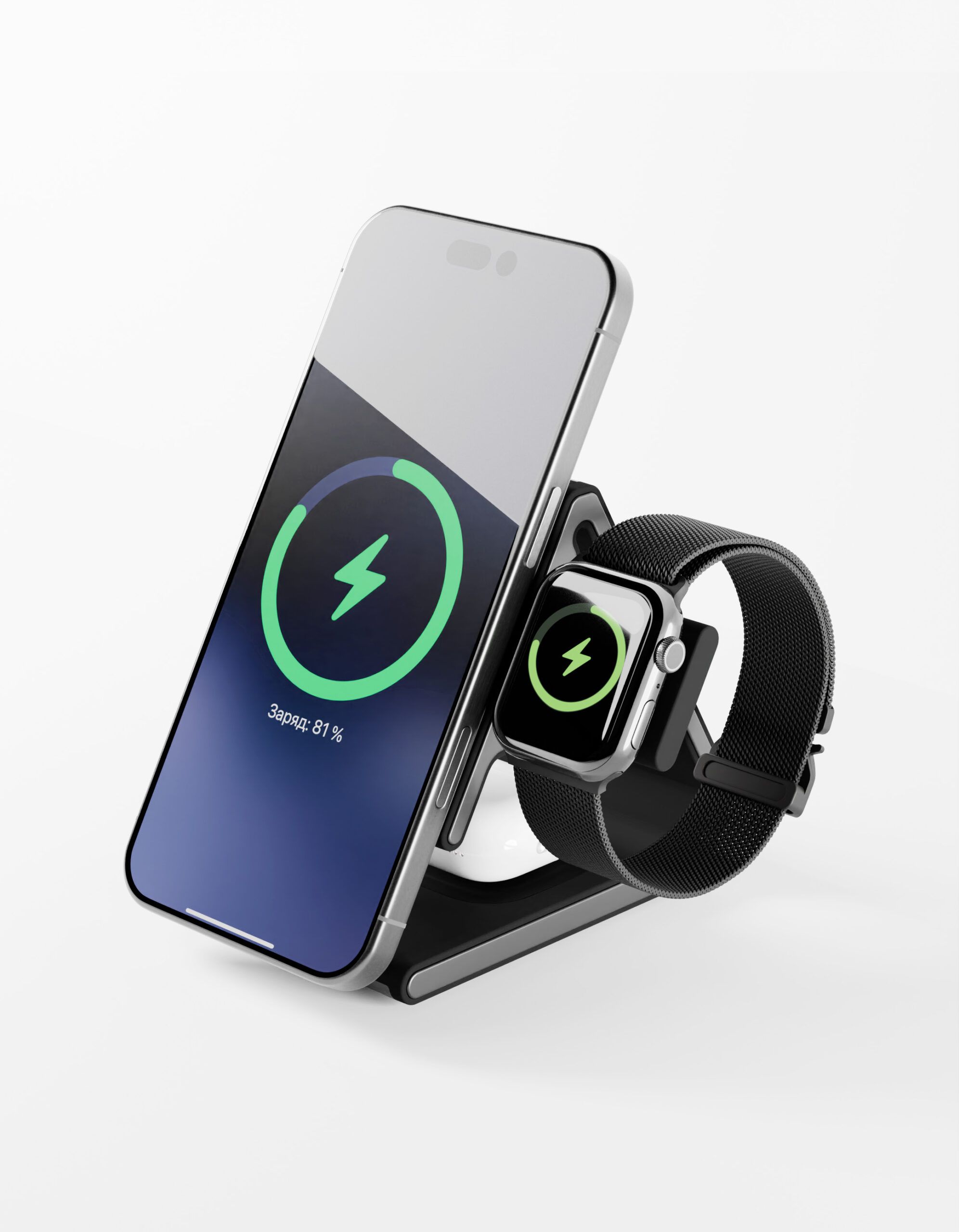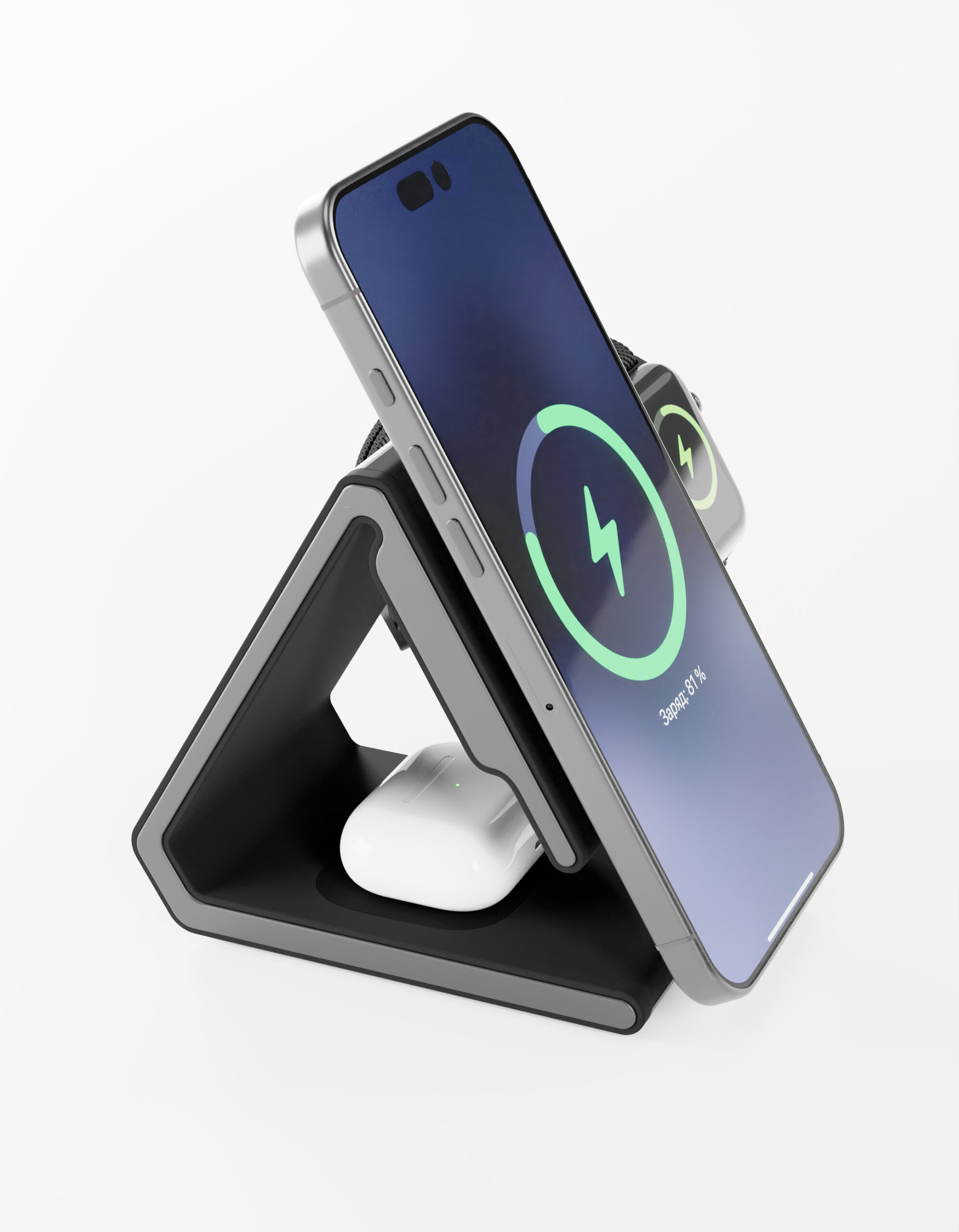 Устройство позволяет заряжать смартфон , умные часы (Apple Watch) и наушники (AirPods) одновременно. Поддержка стандартов MagSafe и Qi2 обеспечивает точное позиционирование и быструю беспроводную зарядку до 15 Вт. iPhone 12/13/14 заряжается до 50% за 30 минут.