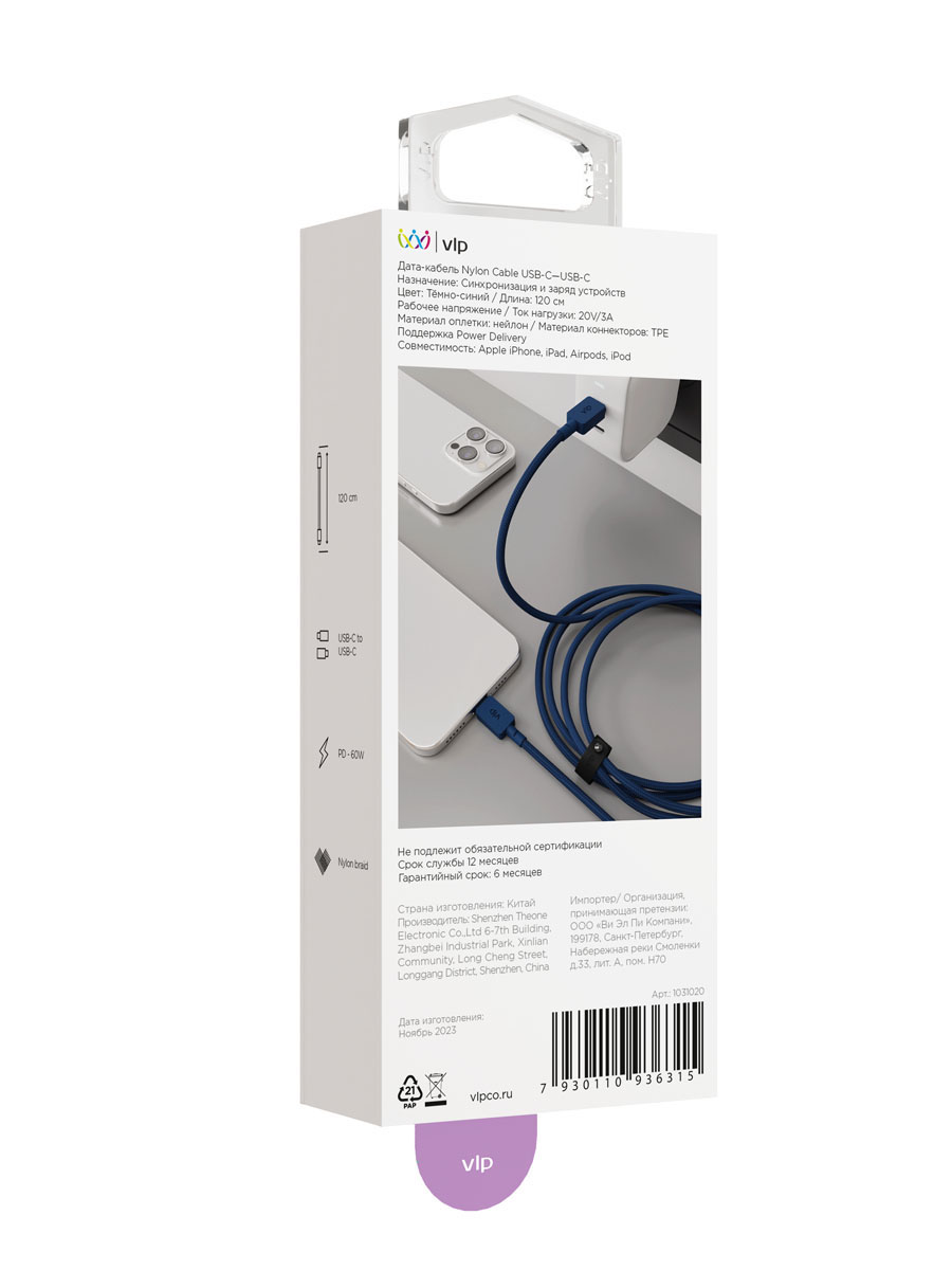 Кабель VLP Nylon USB-C - USB-C, 1,2м Темно-Синий